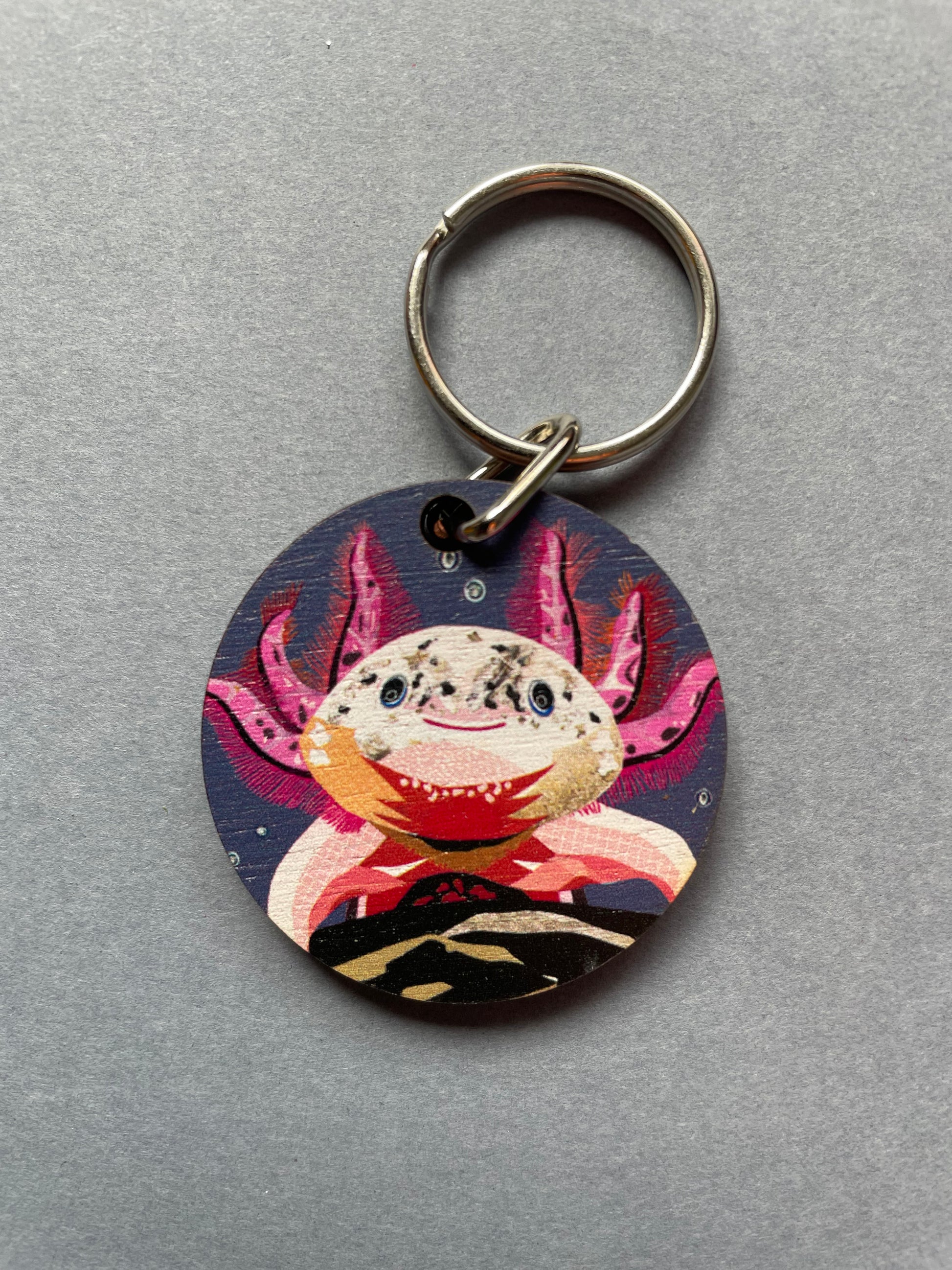 Axolotl wooden keyring. Made from smooth, durable wood and measuring 4x4cm, it's lightweight yet sturdy. Delivered in a small letter box.