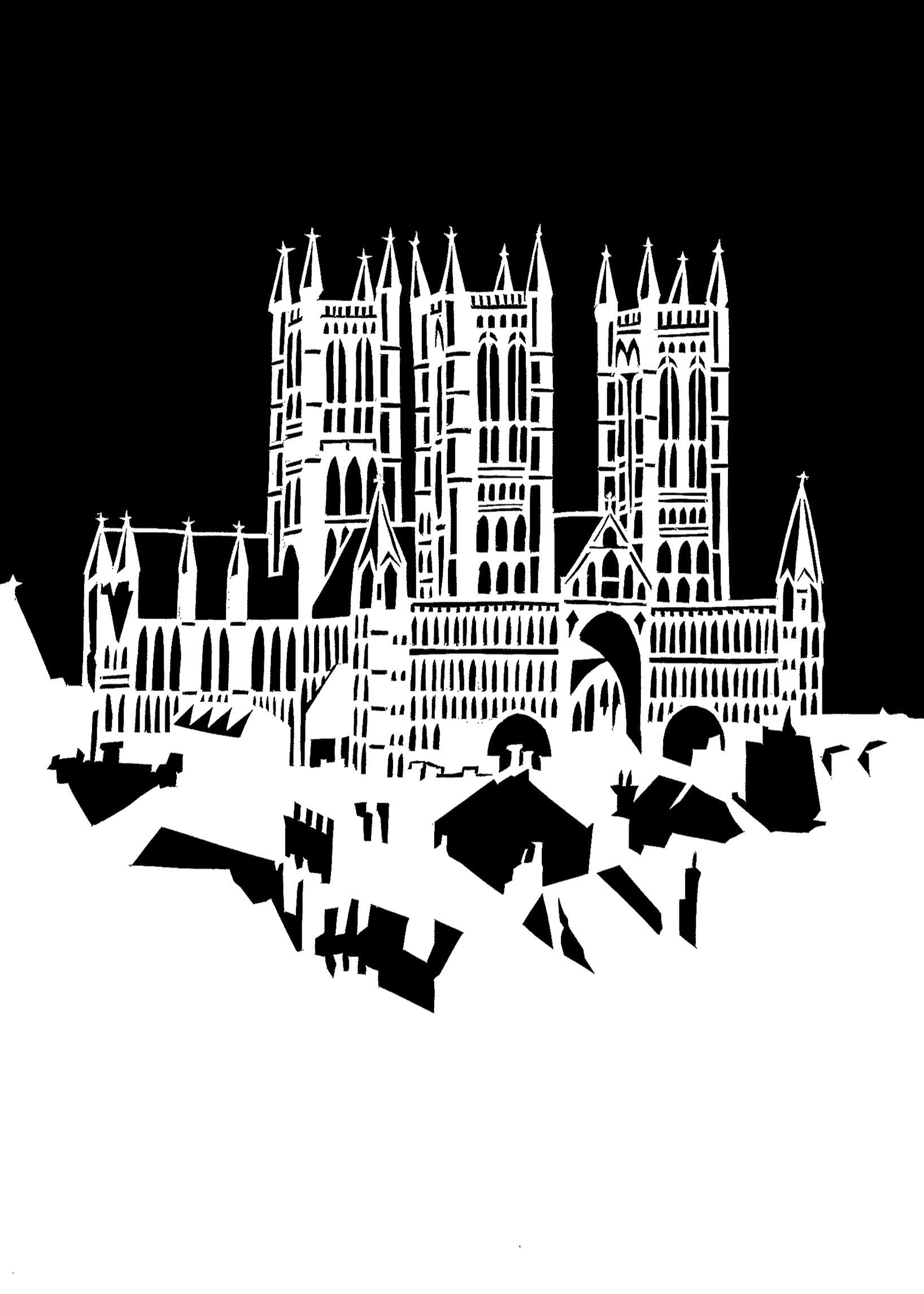 A4 black and white Lincoln Cathedral print. Delivered in a protective plastic sleeve with a sturdy backing board, and printed locally to Lincoln. Original artwork hand-cut collage.
