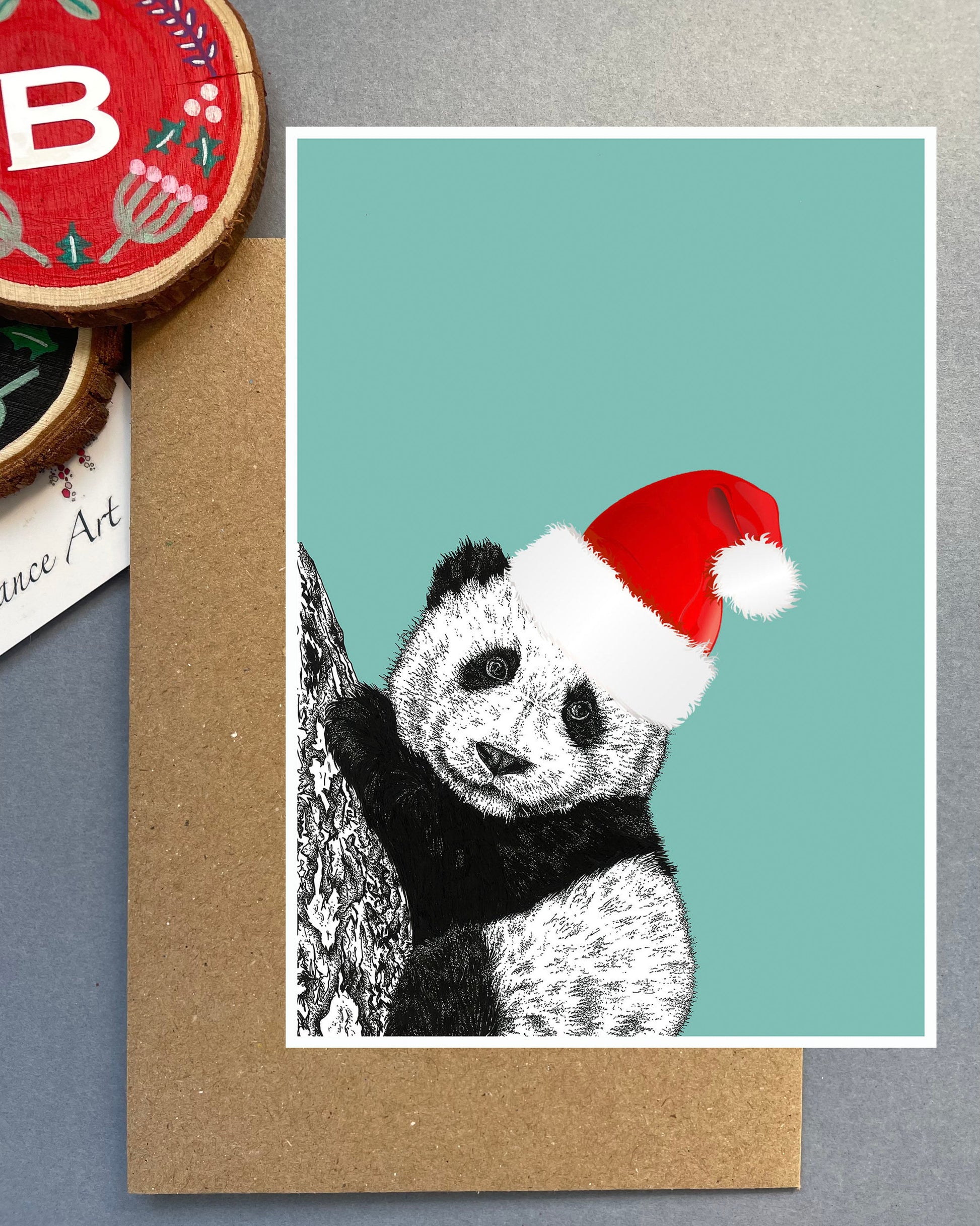 Christmas Panda card. Printed on high-quality cardstock with a blank interior, and brown envelope. Delivered in protective plastic sleeve. Original artwork hand drawn.