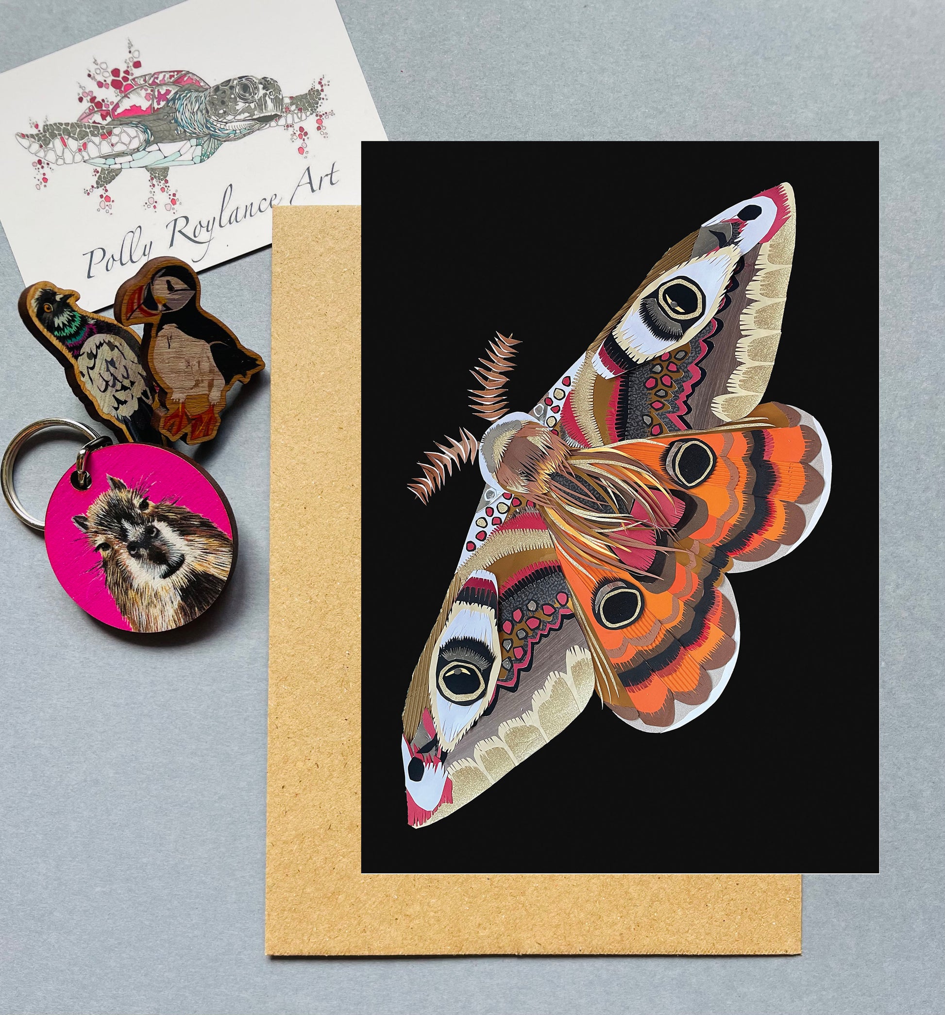 Emperor Moth card. Printed on high-quality cardstock with a blank interior, and brown envelope. Delivered in protective plastic sleeve. Original artwork paper collage.