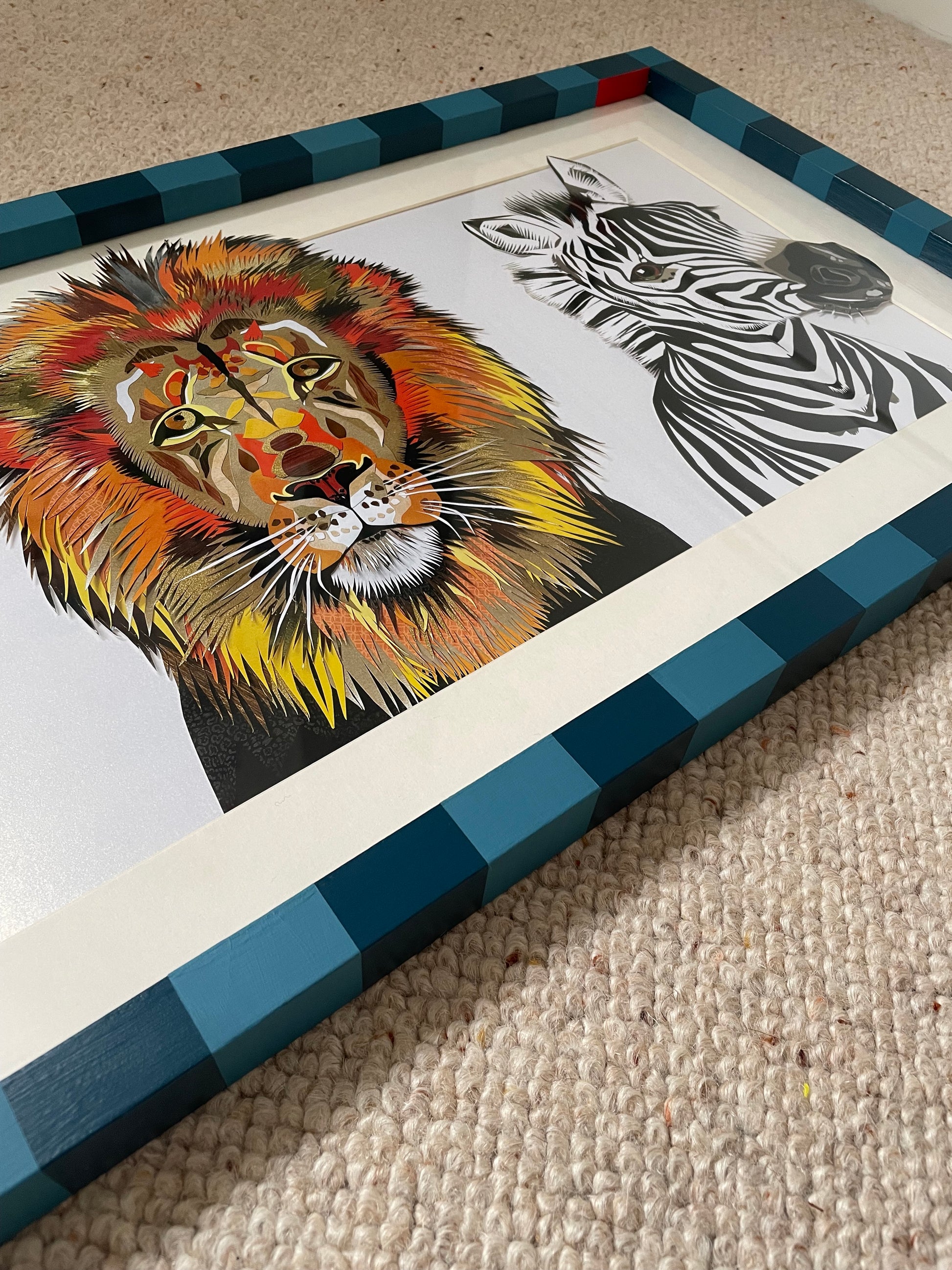 This is a one-off hand painted frame. The blue striped frame with the odd red square giving personality to your child's bedroom. This combined print features the popular safari animals, cut out to lay over the mount, still capturing the intricate layers created in the original paper collages.