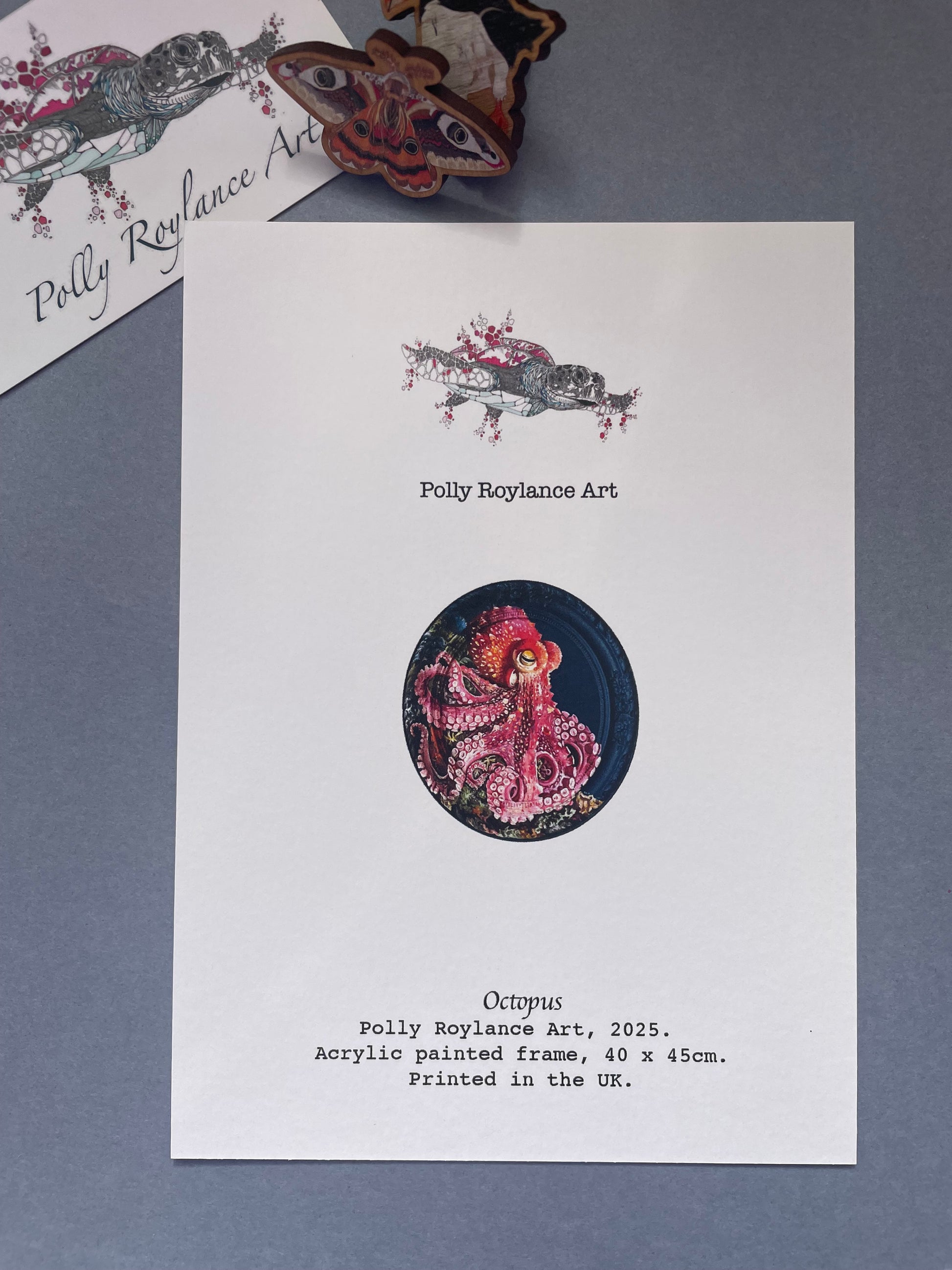 An ornate antique frame, painted in acrylics, holds the central scene of a powerful yet graceful octopus entwined within a vibrant coral reef. The tentacles breach the border, curling out over the frame.