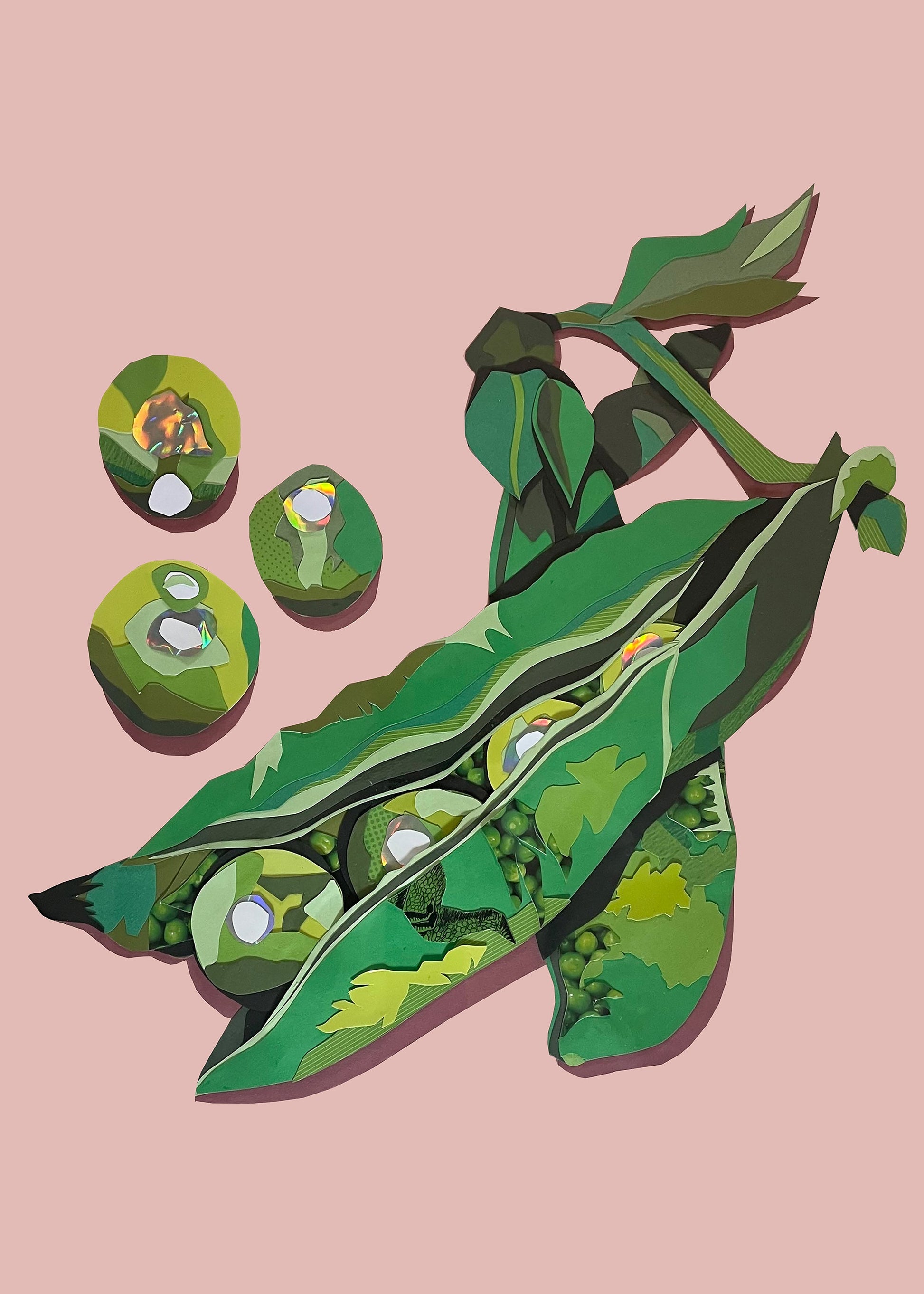 A4 Peas print. Delivered in a protective plastic sleeve with a sturdy backing board, and printed locally to Lincoln. Original artwork created with paper collage.