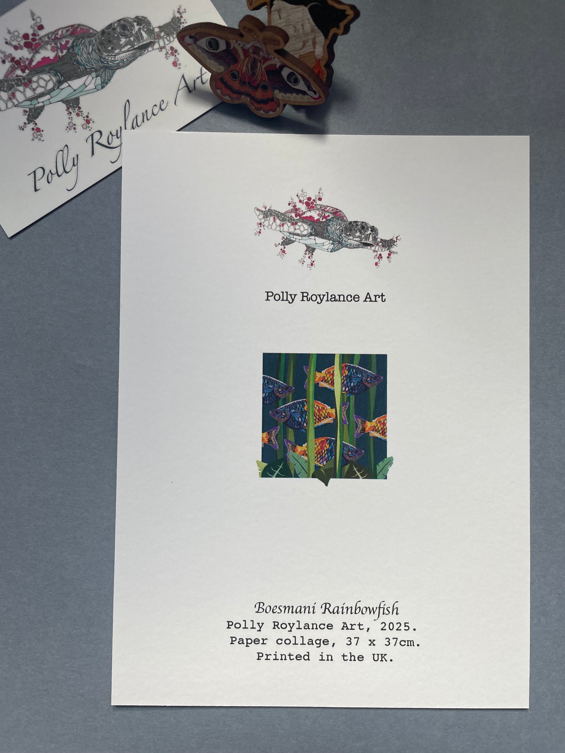 A vibrant paper collage capturing the colourful and intricate scales of the Rainbowfish as it winds its way through swaying reeds. Sections of this artwork pushing past the mount, creating a dynamic and unique effect that brings the scene to life.