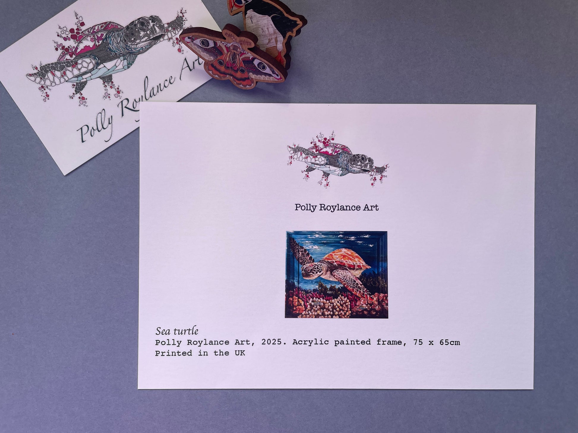 A majestic sea turtle, swimming gracefully through a vibrant coral reef, is the central subject within the piece. The painted wooden frame doesn't just contain the artwork - it extends it, allowing the underwater world to spill out beyond the edges.