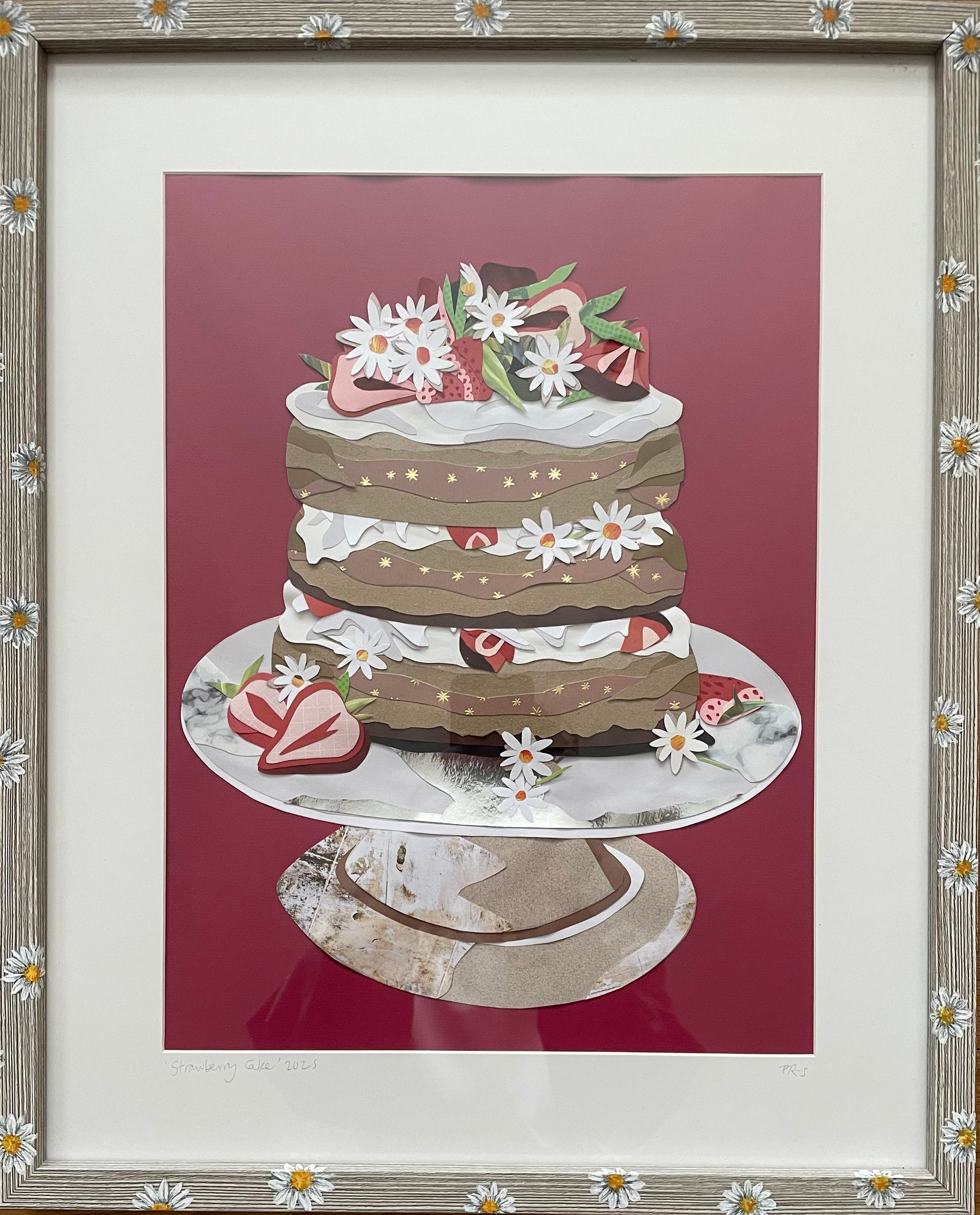 Looking to make a bold statement in your kitchen? This one-of-a-kind paper collage is the centerpiece. The intricate, textured layers of cake create visual depth and charm, while the hand-embellished daisy frame adds a playful touch of elegance. A true conversation starter for any home.
