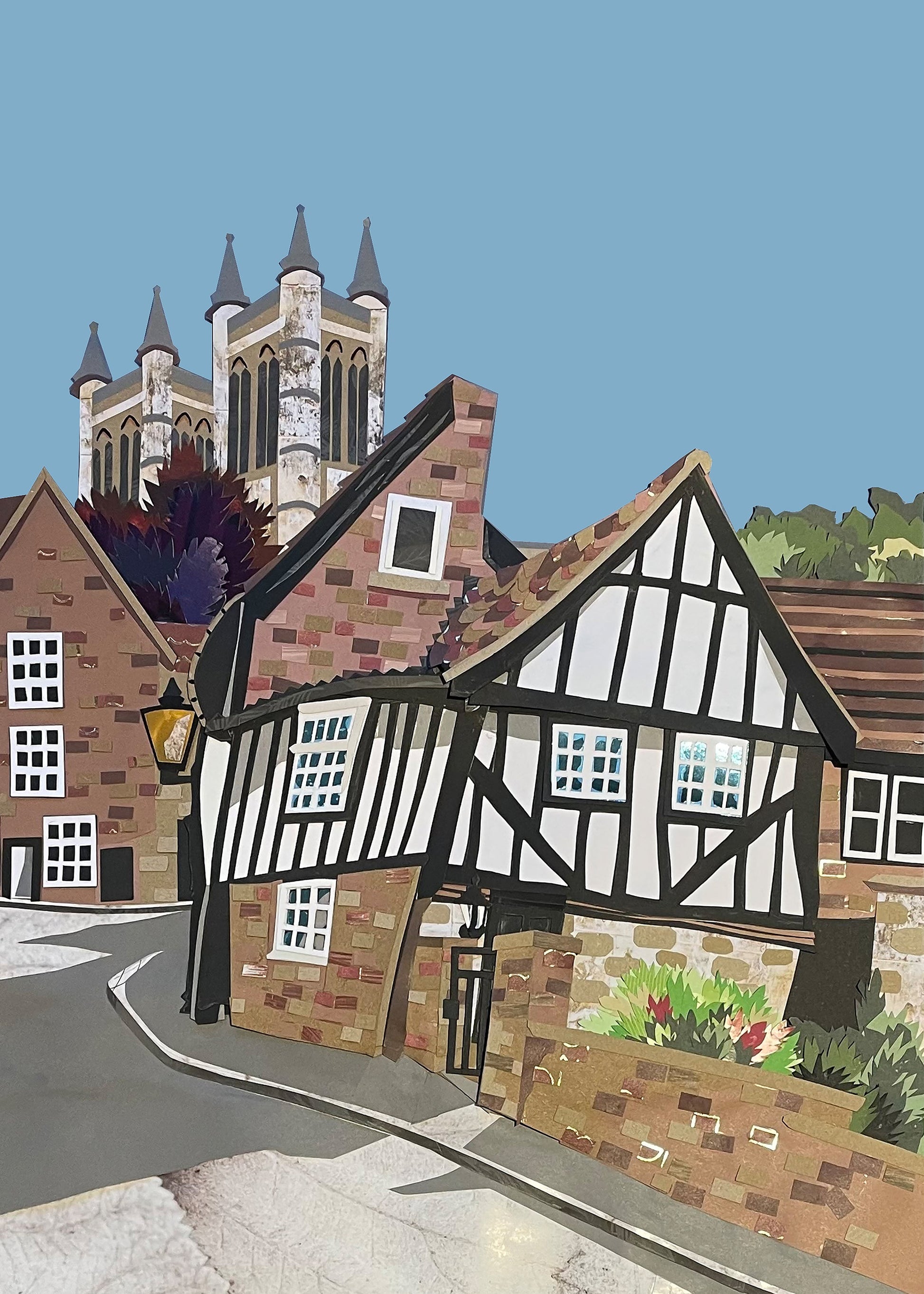 A4 Wonky House print. Delivered in a protective plastic sleeve with a sturdy backing board, and printed locally to Lincoln. Original artwork created with paper collage.
